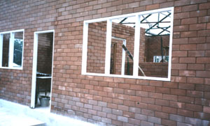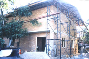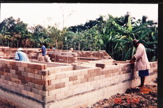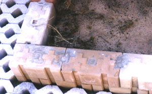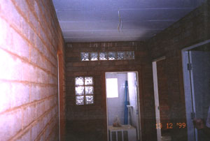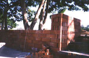กับทรายละเอียด 1:1 ผสมน้ำให้เป็นครีมเหลวเทในรูทุกรูให้เต็ม ทำรอบบ้านทั้ง 4 ด้านจนครบแล้วจึงเรียงขึ้นไปอีกจนได้ความสูงที่ต้องการ