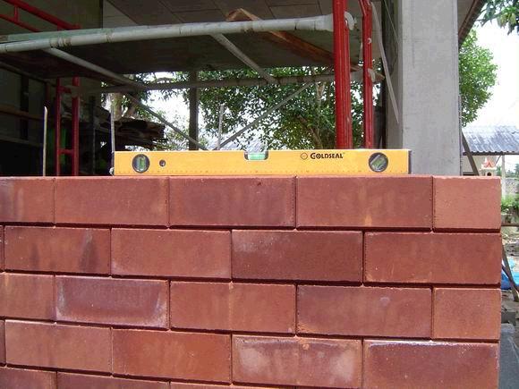 2.ก่อผนังแถวแรกโดยใช้ปูนทรายเพื่อปรับระดับให้เสมอกันกับเส้นเอ็นตลอดแนวผนังก่อน