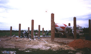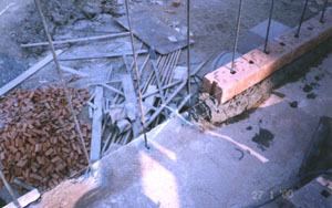 1.เตรียมพื้นเทคอนกรีตให้ได้ความหนาตามต้องการ วางเรียงอิฐเพื่อกะระยะเสียบเหล็กเส้นประมาณ