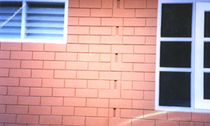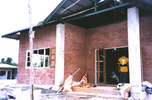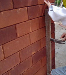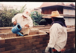 กับทรายละเอียด 1:1 ผสมน้ำให้เป็นครีมเหลวเทในรูทุกรูให้เต็ม ทำรอบบ้านทั้ง 4 ด้านจนครบแล้วจึงเรียงขึ้นไปอีกจนได้ความสูงที่ต้องการ